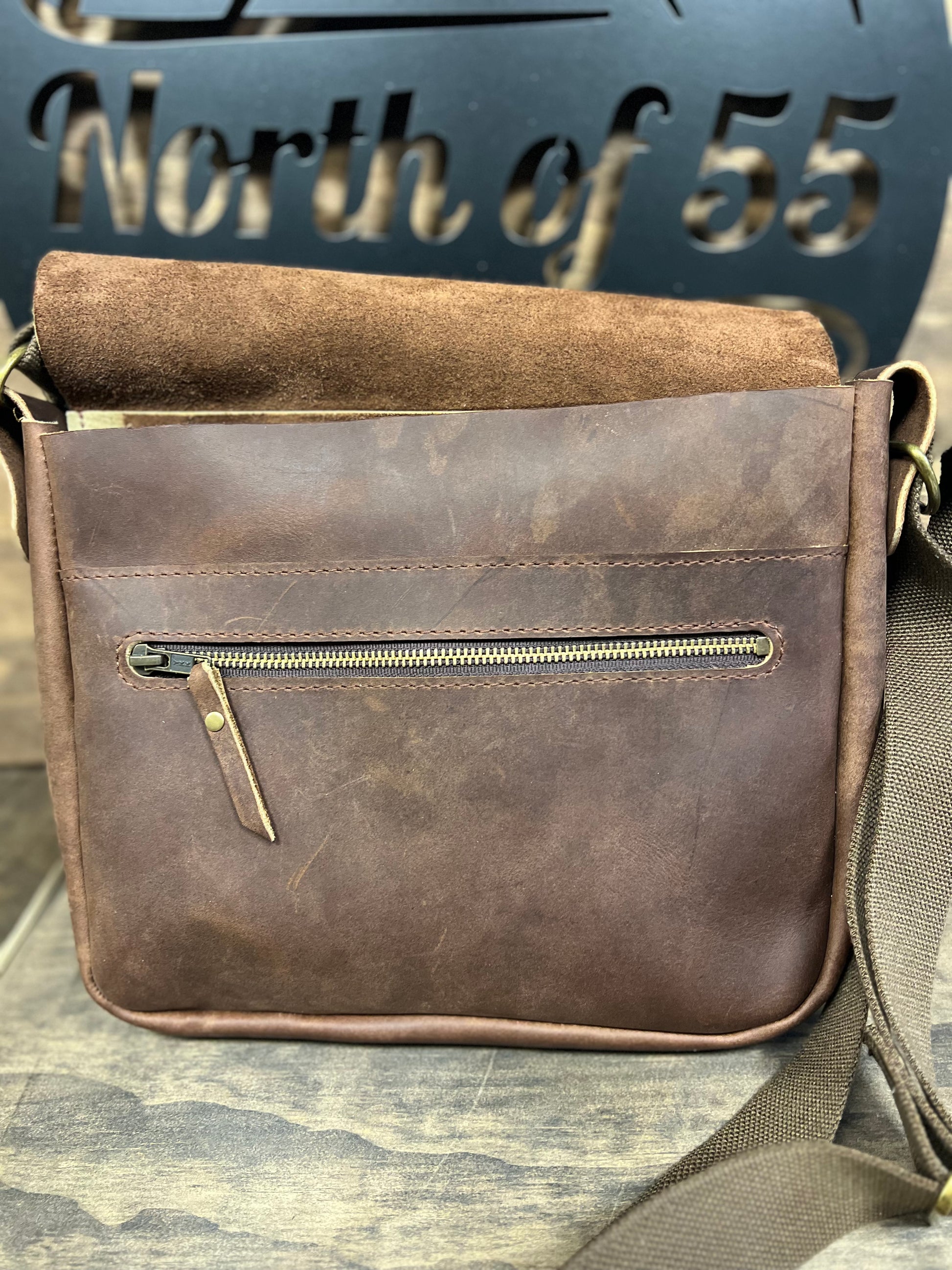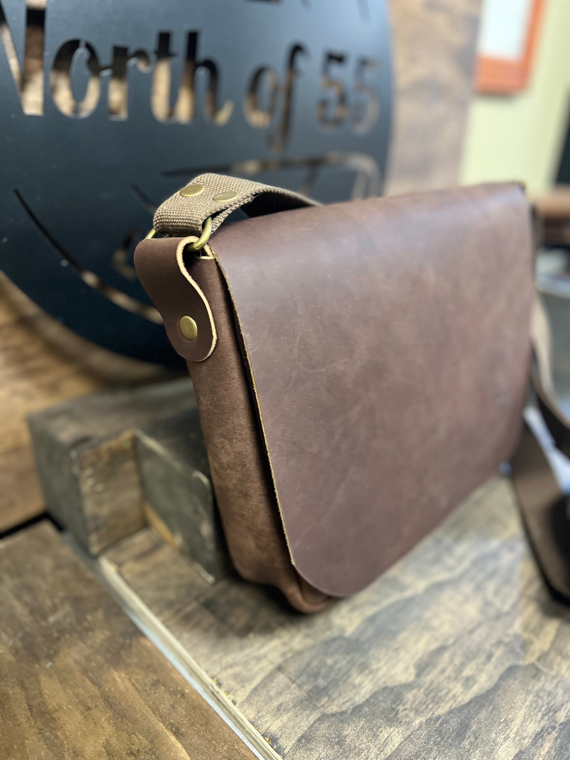 Messenger bag made with S.B. Foot Dark Amber Harness leather. Bag has one zippered pocket and tow compartments inside. Canvas strap.