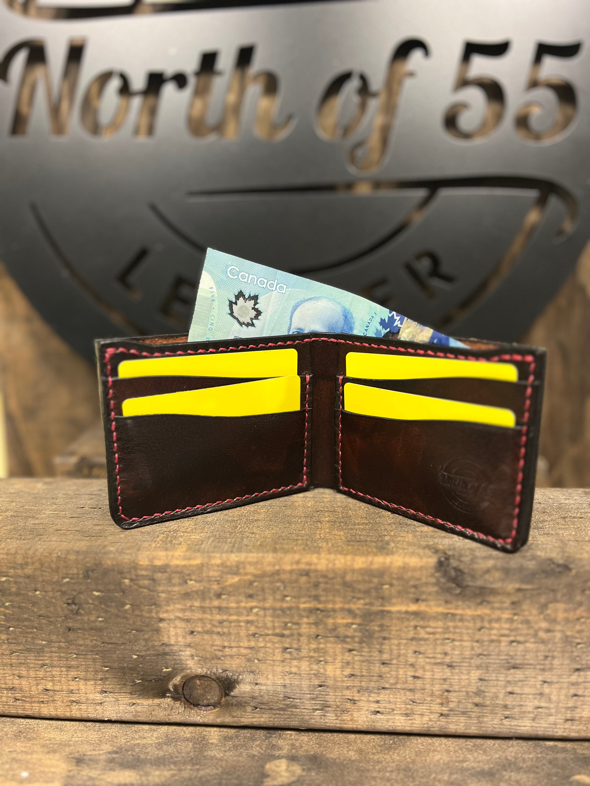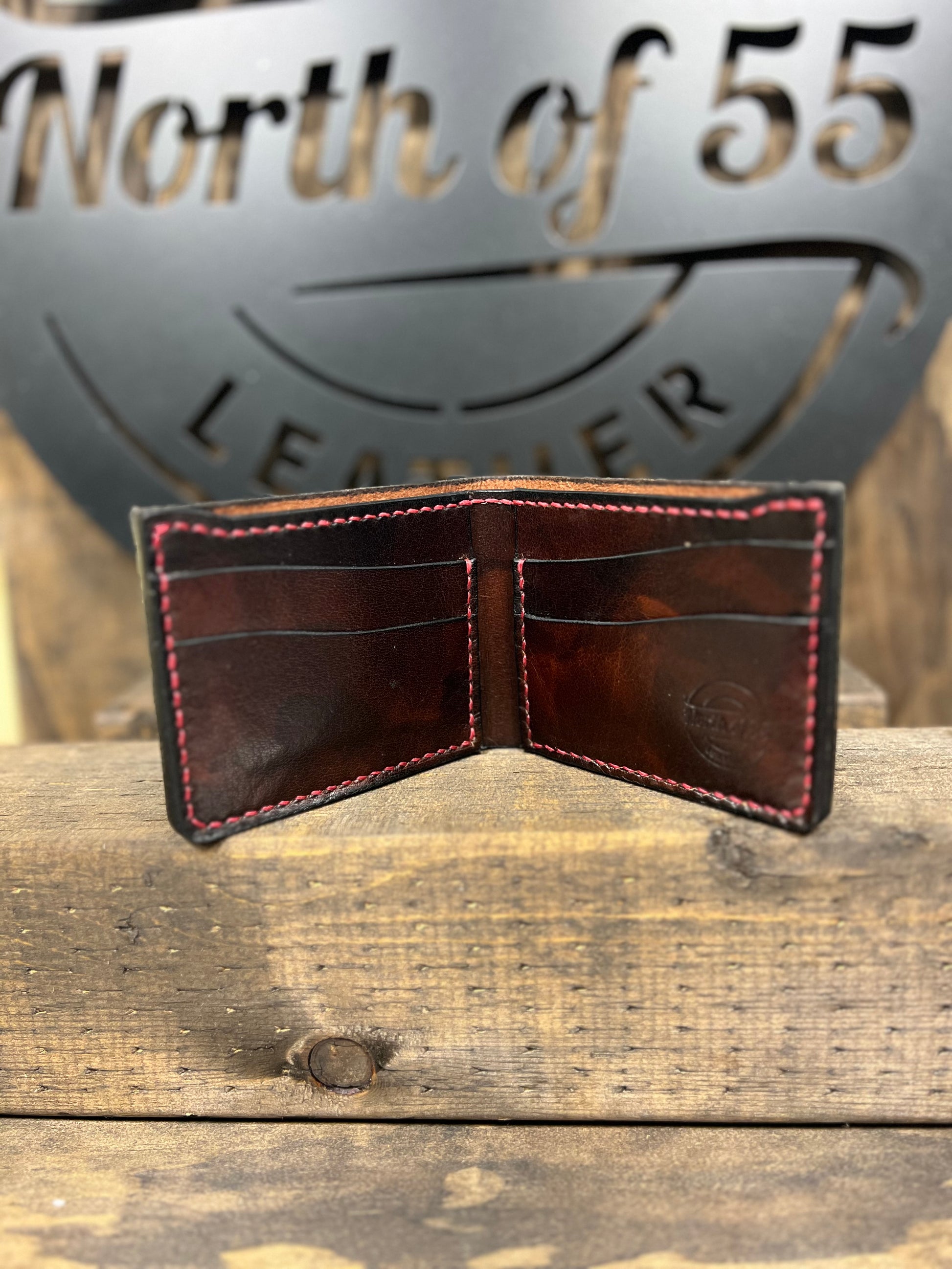 Traditional wallet is a classic. This is a bifold wallet with 2 card slots and a stash pocket on each side plus a bill pocket. This wallet is made from full grain leather and is hand stitched with wax thread. This wallet will last generations.